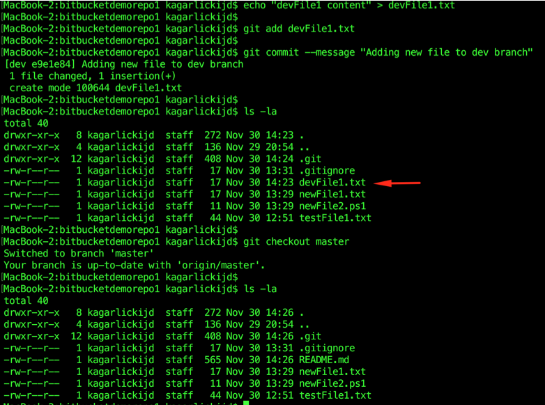 Посмотрим содержимое dev ветки командой ls -la , переключимся в ветку master и убедимся что в ней файла devFile1.txt нету: