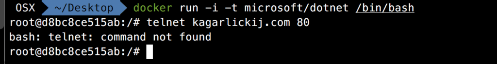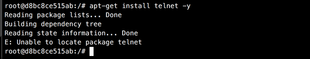 Sometimes you might need to execute telnet from Docker container, but telnet typically isn’t installed and can’t be installed easily.
